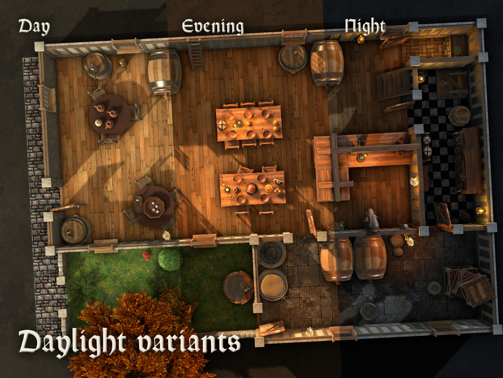 A set of top-down tavern interior maps.